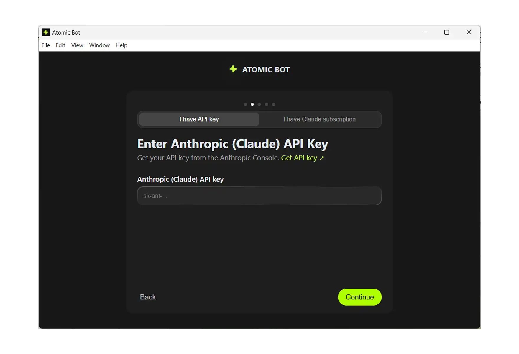 Atomic Bot will ask for your API key from the provider you selected. There's a direct link to get one β click Get API key and it takes you straight to the right page. Paste your key, hit Continue.